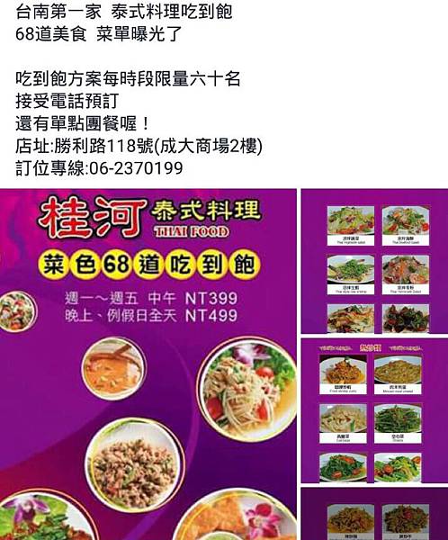 台南桂河泰式料理吃到飽(成大店)預約專線:06-2370199地址:台南市東區勝利路118號(成大商場2樓) 成大店是吃到飽,永康店則是單點式的已吃到飽的價位來說,這樣的口味已經算很好吃了。可是前提是,不能跟一般所謂單點泰式料理的口味上來比較。因為是吃到飽,在菜色跟口味上當然會比不上單點式的料理,不過這間基本口味上來說是算蠻好吃的啦!非常適合朋友聚餐以及家庭聚會來用餐,因為非常的划算!以下簡單介紹當天所點的料理菜色
